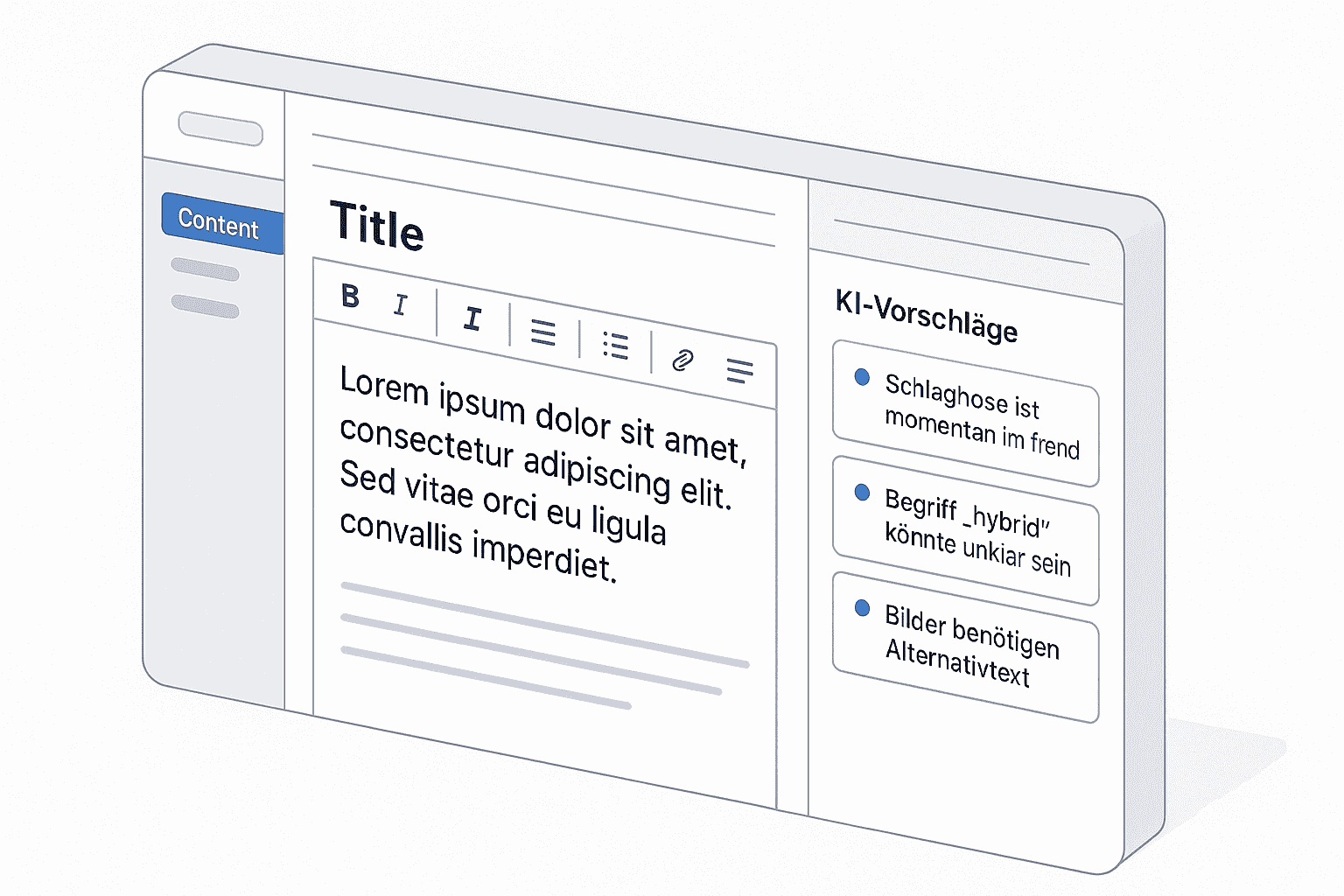Schreiben wir an einem Text über Sommermode, mag es die Schlaghose sein, auf die die KI hinweist. Oder der weiße Pfirsich, wenn wir über aktuell beliebte Zutaten für Fruchtsalat schreiben. Oder es ist das hybride headless CMS, das mittels AI Suite für Effizienzsteigerung und Skalierung sorgt.