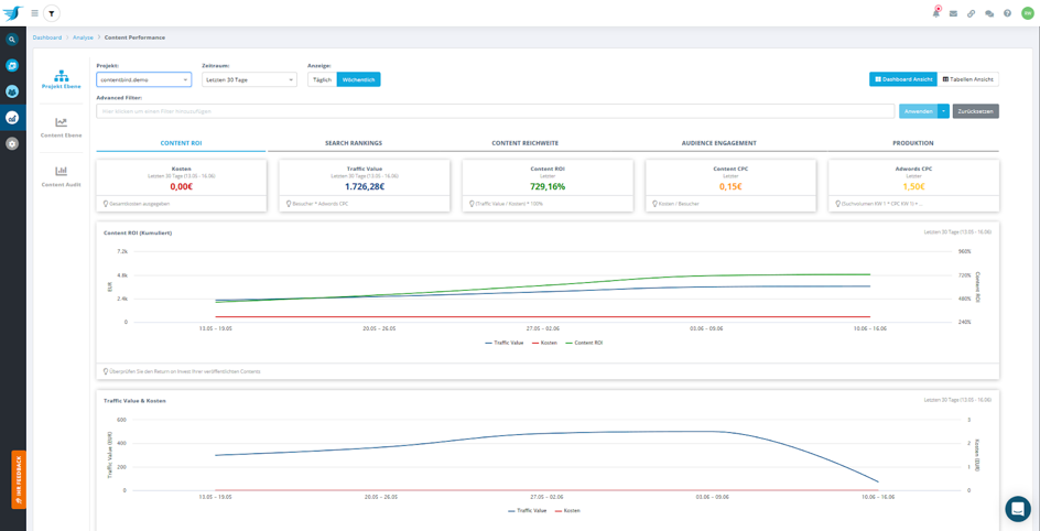 Die Analyse teilt sich auf in Rankings überwachter Keywords und Content Performance. Letzteres teilt sich dabei auf in: Content Reichweite, Audience Engagement, Search Rankings, ROI & Kosten und Auswertung der Textproduktionsdauer in verschiedene Stati.