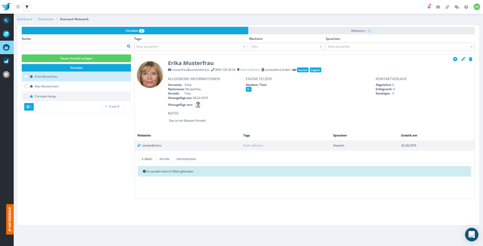 Zweitens greift Contentbird bei der gezielten Bekanntmachung der Inhalte unter die Arme. Sogenannte Outreach-Kampagnen werden über das Customer Relationship Management des Tools gesteuert, welches sich in „Netzwerk“ und die „Mailbox“ aufteilt. Hier werden Kontakte oder interessante Webseiten angelegt, für welche Contentbird automatisch Kontaktadressen finden kann. Die Kommunikation findet in der Mailbox statt. Absenderprofile können mit Mitarbeitern geteilt oder die gesamte Kommunikation als kompletter Thread einem Mitarbeiter übergeben werden. Des Weiteren unterstützen verschiedene Outreach-Templates die effektive Kommunikationsaufnahme für verschiedene Ansprechpartner.