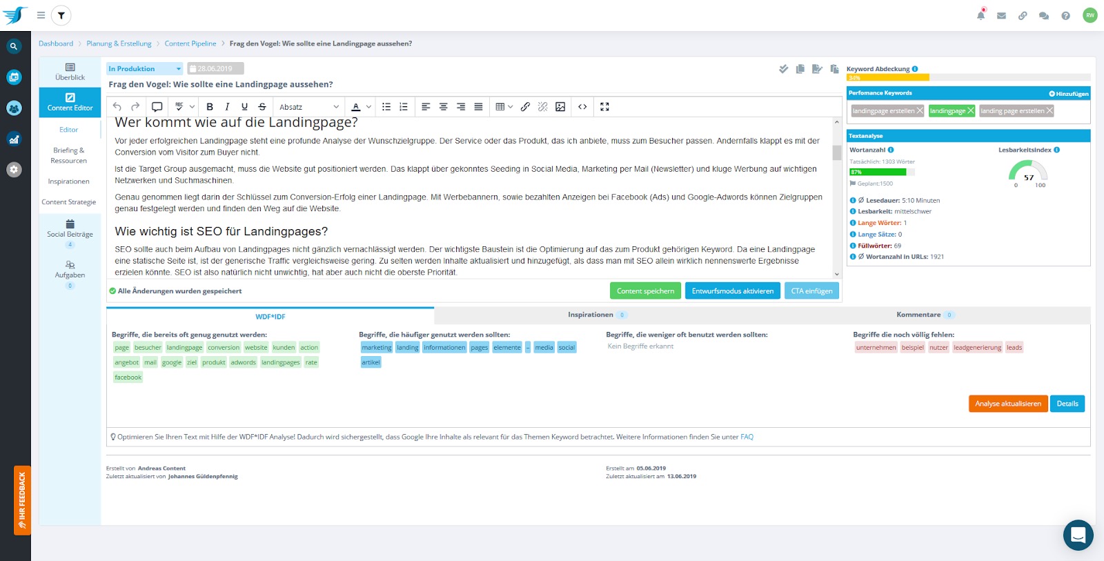 Der Autor wird bei der Texterstellung mit der Prüfung On-Page-relevanter Performancekriterien unterstützt: eingearbeitete Keywords werden angezeigt sowie vorgeschlagene WDF*IDF-Terme und ein Lesbarkeitsindex, der lange Wörter, lange Sätze und Füllwörter anzeigt – alles in Echtzeit. Alle Checks in place? Es geht noch weiter: Duplicate Content Check untersucht das WWW nach 1:1 Textduplikaten. Im Referenz-Modus kann für Content Repurposing die Editoransicht gesplittet werden, um parallel einen weiteren Content aufzurufen und dessen Inhalte zu übernehmen und später zu bearbeiten.