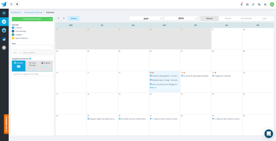 Als Neuerung des Planungsmoduls zeigt ein Drag & Drop Redaktionskalender dieselben Contents der Content Pipeline in Wochen-, Monats- oder Vierteljahresansicht an. Zieht man einen Content in eine andere Woche, so ändert sich das Veröffentlichungsdatum auch in der Content-Pipeline.