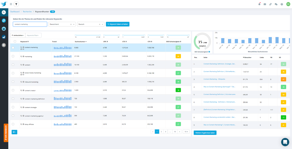 Performance versprechende Ideen werden im Keywordhunter recherchiert, priorisiert und mit einer W-Fragen-Suche komplettiert. Ein News- und Video-Stream im Modul “Erstellung” zum passenden Keyword sorgt für weitere Inspiration. Ideen können mit einem Klick in das Planungsmodul übergeben werden.
