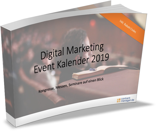Deswegen geben wir Ihnen unseren Digital Marketing Eventkalender 2019 an die Hand. In diesem sammeln wir die wichtigsten Kongresse, Messen und Barcamps. Auf einen Blick, übersichtlich gestaltet und nach dem Download stets griffbereit. Und das Beste: Für einige Veranstaltungen erhalten Sie als Leser von Contentmanager.de exklusive Rabatte, die wir stetig weiter ausbauen.