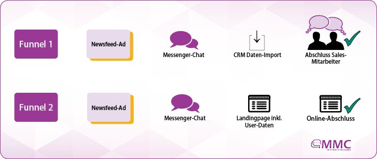 Wie gesagt, starten viele der Cases, die wir mit den Kunden umsetzen, mit Facebook Ads. Ein Vorteil liegt auf der Hand: Dadurch, dass die Nutzer im Ökosystem “Facebook” bleiben, ist der Funnel sehr einfach und für den Nutzer wechselt dabei nur kurz die App. Dabei muss man zwei Funnel unterscheiden: